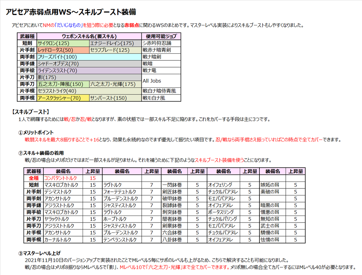 アビセアの弱点は↑の画像の通り各武器のWSが必要となるため、それぞれ用意する必要があります。D1である必要はありませんが、D値が低い程敵が長持ちして弱点を狙えるチャンスが増えます。